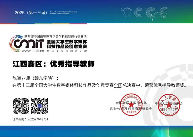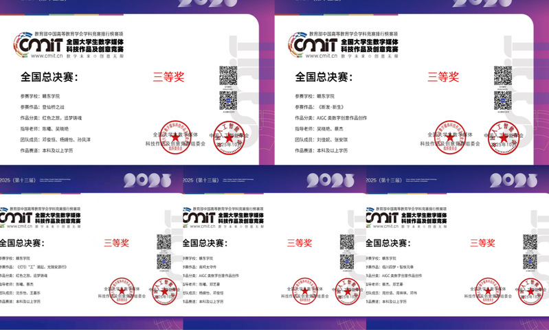 在2025年全国大学生数字媒体科技作品及创意竞赛全国总决赛的激烈角逐中,248cc永利集团人文学院学子获国家三等奖5项,省级一等奖4项、省级二等奖1项,指导教师获“优秀指导教师奖”。