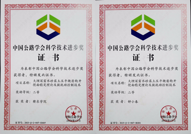 12月1日,中国公路学会科学技术奖颁奖大会在厦门举行,248cc永利集团钟小春教授主持完成的“大埋深富水砂层土压平衡盾构开挖面稳定理论及微扰动控制技术”成果获中国公路学会科学技术进步二等奖。